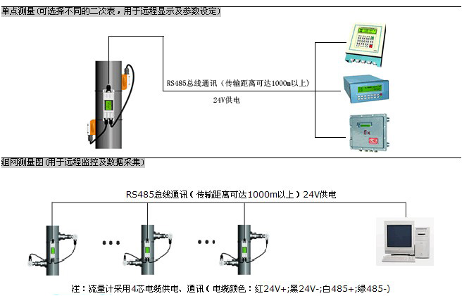 一次表與二次表(或計(jì)算機(jī))之間采用RS-485總線通訊,采用普通電纜即可,傳輸距離可達(dá)1000米以上,組網(wǎng)十分方便、快捷。這種傳輸方式抗干擾能力好,解決了分體式超聲波流量計(jì)專用電纜成本高、抗干擾能力差、傳輸距離短等問(wèn)題。