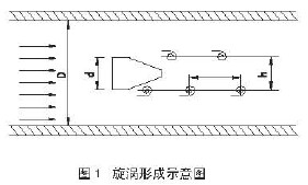 實(shí)驗(yàn)證明:當(dāng)兩列旋渦之間的距離h和同列兩個(gè)旋渦之間的距離L滿足L/h=0.281時(shí)非對(duì)稱旋渦列就能保持穩(wěn)定狀態(tài)。當(dāng)流體雷諾數(shù)Re在5000-15000之間范圍內(nèi)時(shí),Sr基本不變,所以d和Sr為定值時(shí)旋渦發(fā)生體的頻率f與流體的平均流速成正比,即與體積流量Q成正比而與壓力、溫度、密度等無(wú)關(guān)。