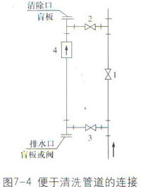 智能電磁流量計不管是水平安裝或者是垂直安裝,在連續(xù)生產(chǎn)的工藝管道上,為了不影響生產(chǎn),便于儀表維修拆裝,傳感器盡可能采用與原先主工藝管道并聯(lián)安裝(旁路管)的方式,特別對有嚴(yán)重污染要經(jīng)常清洗的液體。圖7-4所示是傳感器不卸下,在線清洗安裝實例。