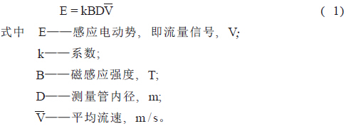 電磁流量計的基本原理是法拉第電磁感應(yīng)定律,即導(dǎo)體在磁場中切割磁力線運動時在其兩端產(chǎn)生感應(yīng)電動勢。如圖1所示,導(dǎo)電性液體在垂直于磁場的非磁性測量管內(nèi)流動,與流動垂直的方向上產(chǎn)生與流量成比例的感應(yīng)電勢, 電動勢的方向按弗來明右手規(guī)則,其值如下式: