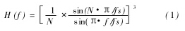 當(dāng)流體流速較小時, 工頻干擾信號與有效流量信號在同一數(shù)量級, 嚴(yán)重影響測量結(jié)果。已知工頻耦合噪聲基波頻率為 50 Hz , 因此可以采用模擬或數(shù)字濾波器使濾波器帶寬限制在 50 Hz以內(nèi)以抑制噪聲。在實(shí)際應(yīng)用中使用 Sigma Delta模數(shù)轉(zhuǎn)換器 AD7714內(nèi)部包含的數(shù)字濾波模塊, 數(shù)字濾波器相對模擬濾波器除具有靈活性高、參數(shù)設(shè)置方便等特點(diǎn)之外,還可以降低 A /D 轉(zhuǎn)換期間引入的噪聲。AD7714數(shù)字濾波器為 ( sinx /x )3低通濾波器, 其在頻域的傳遞函數(shù)為: