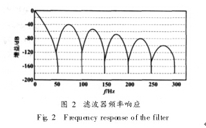 式中: fs為采樣頻率; AD7714采樣頻率為 1912 kHz ; N為濾波采樣個數(shù); f 為數(shù)字濾波器響應(yīng)頻率。通過設(shè)定濾波采樣個數(shù)可以改變數(shù)字濾波器的截止頻率和一次陷波頻率。在本設(shè)計中綜合考慮模數(shù)轉(zhuǎn)換速度和去除噪聲性能, 設(shè)置 N 值使濾波器截止頻率為 50 Hz, 濾波器頻域響應(yīng)如圖 2所示, 濾波器對工頻 50 Hz及其偶次諧波有很好的抑制作用。