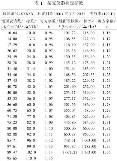 電磁流量計(jì)是一種直接測量流體流量的儀器,因此所測流量可直接讀取。而用渦輪流量計(jì)求取流量時(shí),首先需要經(jīng)過大量的線性回歸和公式計(jì)算,計(jì)算煩瑣且精度不高,給資料的解釋工作帶來較大難度。電磁流量計(jì)一般要經(jīng)過標(biāo)定才能在現(xiàn)場應(yīng)用,某支儀器的標(biāo)定參數(shù)見表1。