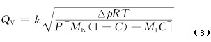 0 引言 針對(duì)瓦斯抽放管道中流量計(jì)量裝置不同的安裝環(huán)境,目前煤礦使用的流量計(jì)主要有差壓式V錐流量計(jì)和威力巴流量計(jì)、熱線式流量計(jì)。差壓式V錐流量計(jì)和威力巴流量計(jì)需要配置信號(hào)處理儀表,但市場上配置的信號(hào)處理儀表只能采集1個(gè)差壓信號(hào)用于計(jì)算瓦斯抽放管道流量,且沒有考慮環(huán)境條件變化對(duì)流量的影響,不能進(jìn)行實(shí)時(shí)補(bǔ)償,造成流量測量結(jié)果誤差較大。鑒此,一種具有動(dòng)態(tài)補(bǔ)償?shù)?strong>差壓式瓦斯抽放流量儀表,可同時(shí)測試管道差壓、管道負(fù)壓、環(huán)境絕壓、管道溫度、管道瓦斯?jié)舛?個(gè)環(huán)境參數(shù),并對(duì)管道瓦斯流量測量進(jìn)行實(shí)時(shí)補(bǔ)償,提高了流量測量的準(zhǔn)確性。 1 測量原理及補(bǔ)償方法 1.1 傳感器測量原理 差壓式V錐流量計(jì)和威力巴流量計(jì)是由傳感器和信號(hào)處理儀表組成的測量裝置。傳感器產(chǎn)生一個(gè)依據(jù)流量大小而變化的差壓。具有動(dòng)態(tài)補(bǔ)償?shù)牟顗菏酵咚钩榉帕髁績x表采集相應(yīng)管道差壓、管道負(fù)壓、環(huán)境絕壓、管道溫度和管道瓦斯?jié)舛?個(gè)環(huán)境參數(shù),用于計(jì)算流量。常用的差壓式流量計(jì)體積流量計(jì)算公式為 式中:QV為體積流量;k為傳感器的結(jié)構(gòu)系數(shù);Δp為傳感器檢測的差壓;ρ為被測介質(zhì)的密度。 在實(shí)際生產(chǎn)和測試中,k,Δp和ρ都可能造成不同程度的測量誤差。其中k取決于結(jié)構(gòu)加工精密度,出廠前通過水流量計(jì)量裝置實(shí)流標(biāo)定確定;Δp取決于差壓傳感器精度,出廠前精度通過壓力計(jì)量標(biāo)校裝置標(biāo)校;ρ取決于現(xiàn)場測試介質(zhì)狀態(tài),需要根據(jù)介質(zhì)狀態(tài)的變化進(jìn)行實(shí)時(shí)動(dòng)態(tài)補(bǔ)償。 瓦斯抽放管道內(nèi)氣體壓力變化范圍一般為-80~20kPa,溫度變化范圍為0~40℃。管道內(nèi)氣體一般由空氣、CH4及其他烷類氣體組成,空氣和CH4比例占99%以上,因此瓦斯抽放管道內(nèi)其他氣體組分幾乎可以忽略不計(jì),但空氣和CH4的組分比例在不停變化。由此可見,介質(zhì)密度動(dòng)態(tài)補(bǔ)償需要從氣體壓力、溫度和濃度3方面來考慮。 1.2 儀表補(bǔ)償方法 理想氣體狀態(tài)方程: 式中:P為絕壓;V為體積;n為物質(zhì)的量;R為比例常數(shù);T為溫度。 摩爾質(zhì)量計(jì)算公式: M=m/n (3) 式中:M為摩爾質(zhì)量;m為質(zhì)量。 密度計(jì)算公式: ρ=m/V (4) 由式(2)—式(4)可得 ρ=PM/RT (5) 由式(1)和式(5)可得 由于管道內(nèi)氣體主要由CH4和空氣組成,所以混合氣體的摩爾質(zhì)量為 M=MK(1-C)+MJC (7) 式中:MK為空氣的摩爾質(zhì)量;MJ為CH4的摩爾質(zhì)量;C為管道氣體中CH4比例。 由式(6)和式(7)可得