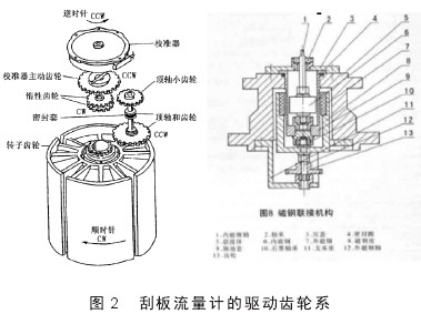 (4)出軸密封部分:出軸密封部分是連接流量計表頭和流量計殼體的部分,它一般有三種結構:磁性連軸器、機械密封式的連接、“O”型密封圈式的連接。這里我們主要分析以磁性聯(lián)軸器為連接的結構易出現(xiàn)的故障。磁性聯(lián)軸器脫磁,包括打滑,溫度升高,都非常容易引起脫磁。無法轉動,就帶動不了精度修正器轉動,那么依次向上,也就不發(fā)生轉動。出軸密封的聯(lián)軸器脫磁,不能發(fā)生轉動,帶動上面的精度修正器里面的齒輪也不發(fā)生轉動,所以字輪也不再轉動(圖2)。