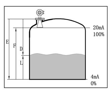 通過(guò)輸入空罐高度E(=零點(diǎn)),滿(mǎn)罐高度F(=滿(mǎn)量程)及一些應(yīng)用參數(shù)來(lái)設(shè)定,應(yīng)用參數(shù)將自動(dòng)使儀表適應(yīng)測(cè)量環(huán)境。對(duì)應(yīng)于4-20mA輸出。 |