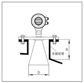 - 如果喇叭直徑大于安裝短管的直徑,包括延伸管在內(nèi)的天線(xiàn)需要從容器里面安裝,并將儀表抬高。選擇延伸管使儀表至少抬高100mm。
