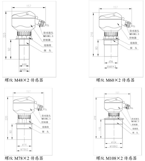 超聲波物位計安裝尺寸 ⑴ 分體式超聲波物位計標(biāo)準(zhǔn)型: ![]() (2)一體式超聲波物位計增強(qiáng)型 ![]() ![]() (3)一體式超聲波物位計防爆型: ![]() 超聲波液位計產(chǎn)品選型