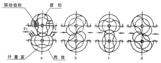 當(dāng)被測(cè)液體流經(jīng)計(jì)量室時(shí),在流量計(jì)的進(jìn)出口形成壓差,腰輪在此壓差的推動(dòng)下旋轉(zhuǎn).同時(shí)通過固定在腰輪軸上的一對(duì)驅(qū)動(dòng)齒輪,使兩個(gè)腰輪保持連續(xù)旋轉(zhuǎn)。隨著腰輪的轉(zhuǎn)動(dòng)。液體經(jīng)由計(jì)量室被不斷排出流量計(jì)。每對(duì)流過的液體量是計(jì)量室容積的四倍,通過密封聯(lián)軸器、減速機(jī)構(gòu)。將旋轉(zhuǎn)次數(shù)減速后傳遞到計(jì)數(shù)器,計(jì)數(shù)器即指示液體瞬時(shí)流量和累積流量.