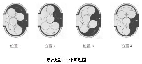 智能氣體腰輪(羅茨)流量計,主要由殼體、共軛轉子、計數(shù)器和智能流量轉換器等部件構成。裝于計量室內的一對共軛轉子在流通氣體的出入口壓差(P入>P出)作用下,通過精密加工的調校齒輪使轉子保持正確的相對位置。轉子間、轉子與殼體、轉子與墻板間保持最佳工作間隙,實現(xiàn)了連續(xù)的無接觸密封。轉子每轉動一周,則輸出四倍計量室有效容積的氣體,轉子的轉數(shù)通過磁性密封聯(lián)軸裝置及減速機構,傳遞到智能流量轉換器,從而顯示輸出氣體的累計體積量。其計量過程和工作原理如圖所示(圖中僅表示了四分之一周期)。